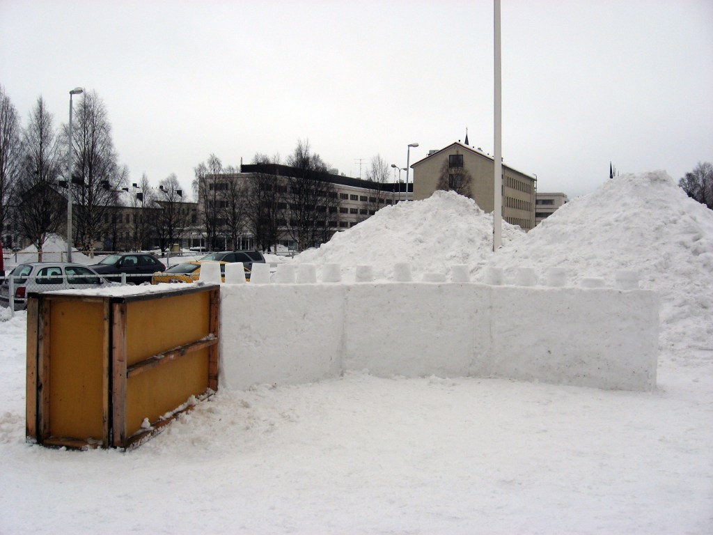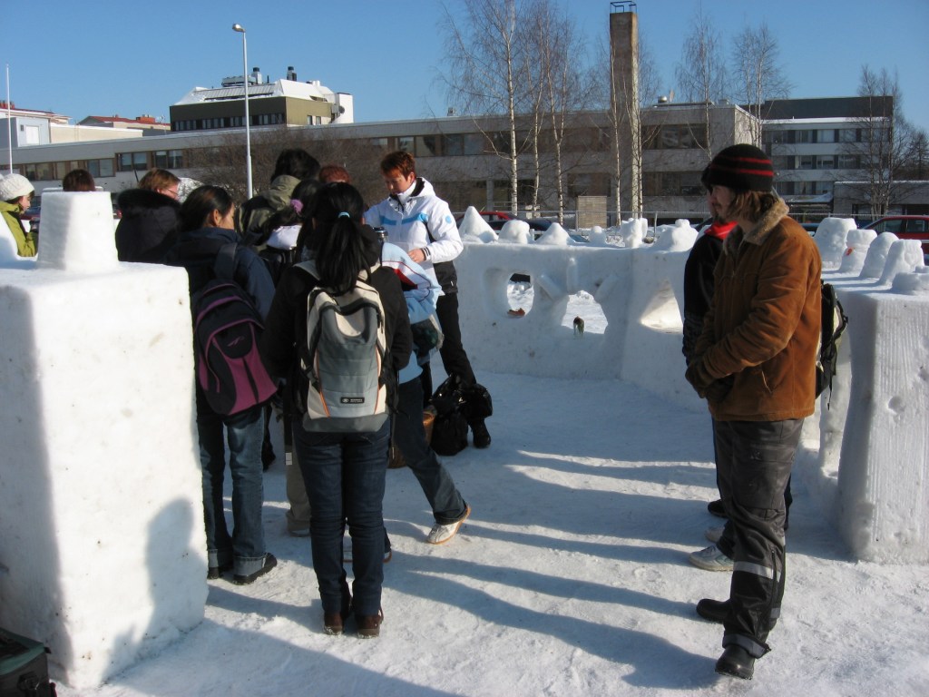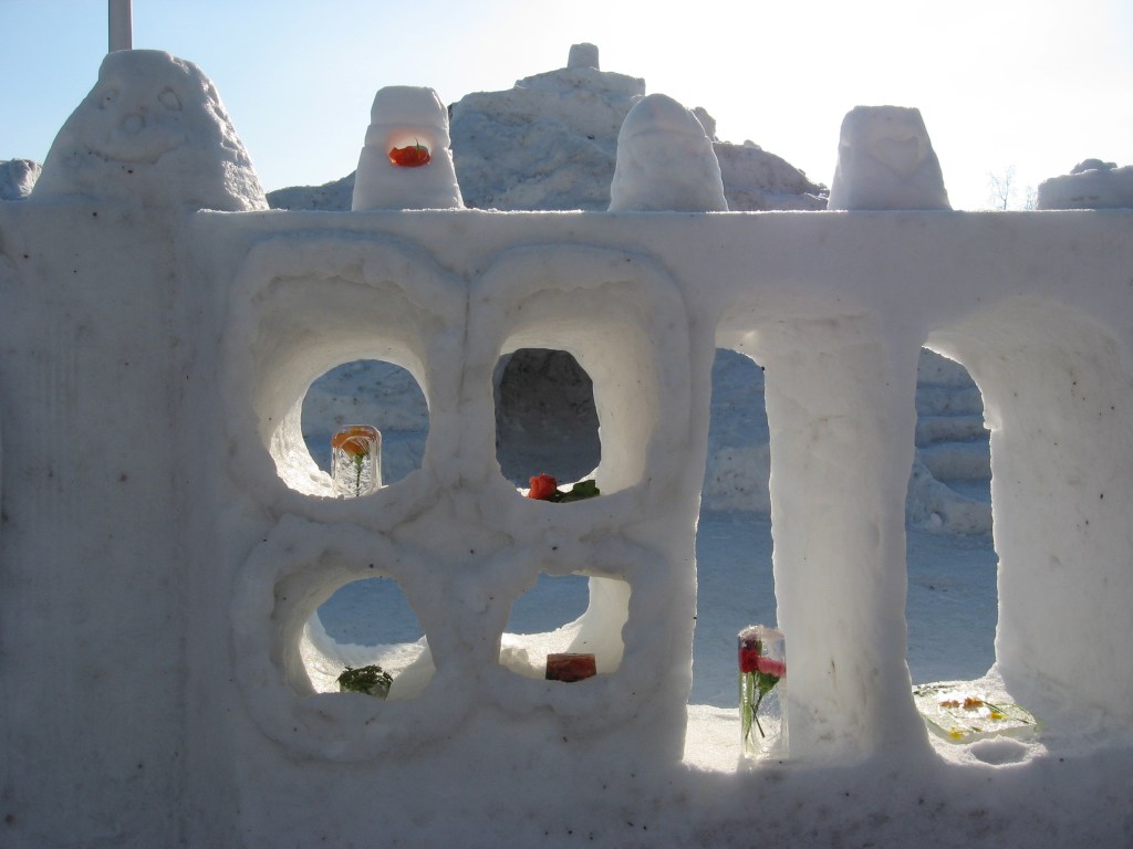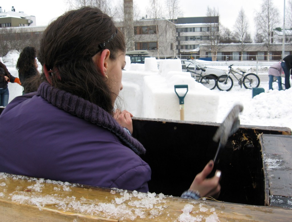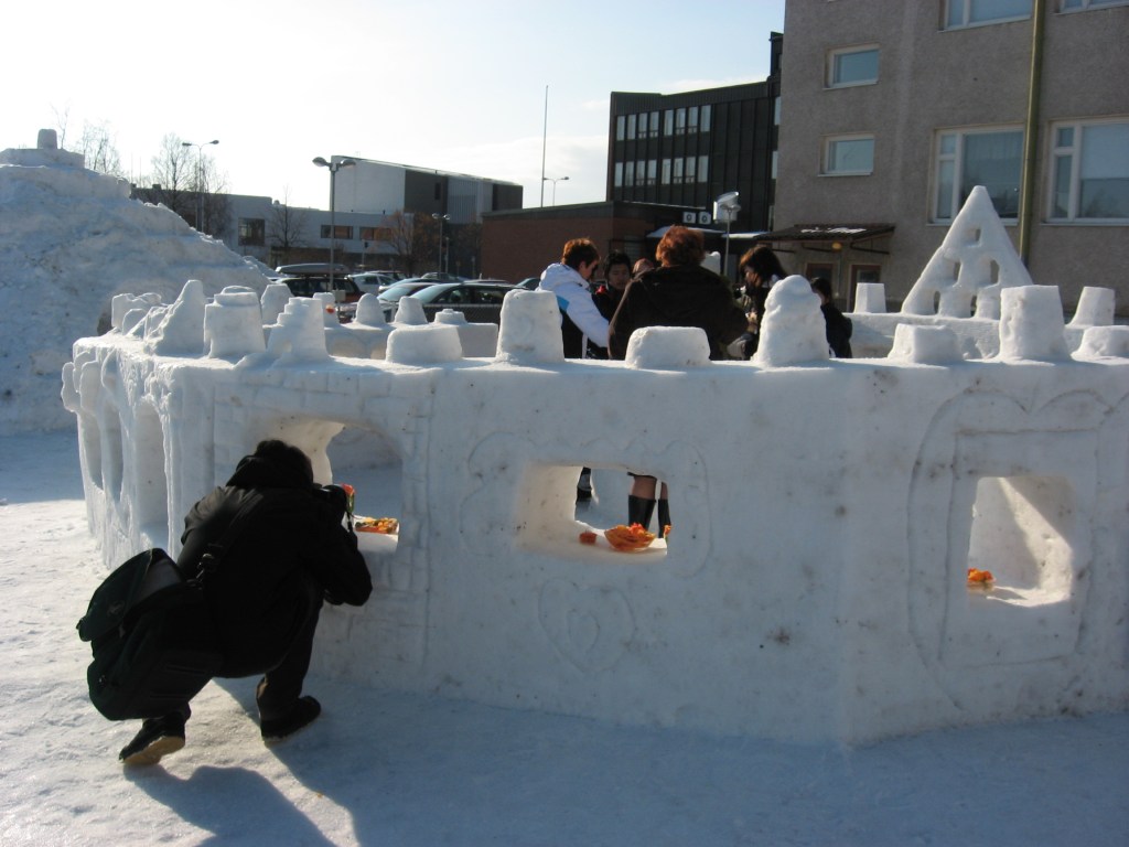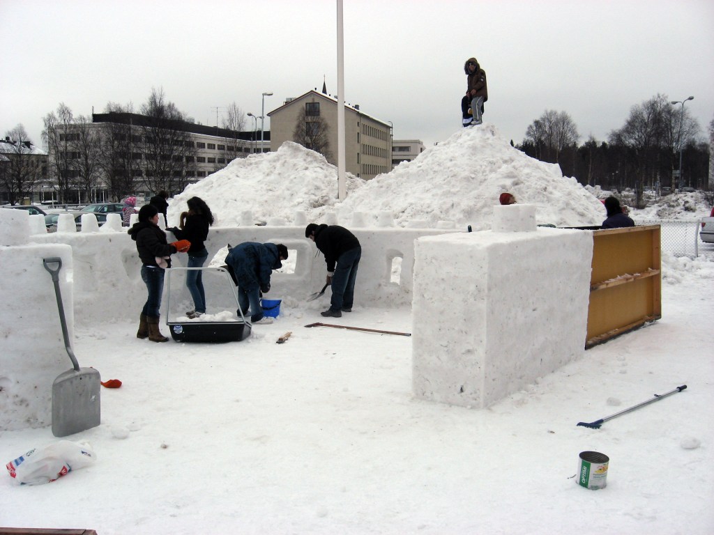 Ensimmäisenä veistopäivänä toteutettiin seinät lumimuottien avulla. Halukkaat laittoivat myös kukkia jäätymään vesiastioihin. Seuraavana päivänä valmistettiin ikkunat. Valmista teosta juhlittiin yhdessä lämpimää mehua juoden ja paikallislehteen haastatteluja antaen.
