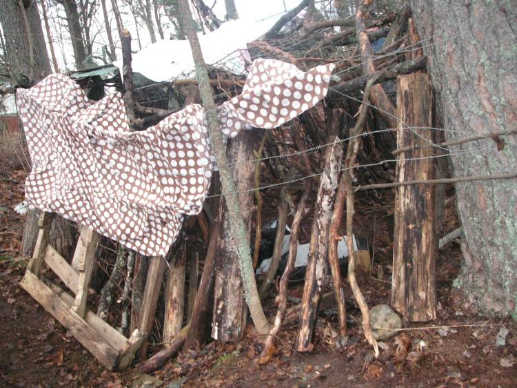 Maja-projekti kesti alimpien luokkien kohdalla päivän, 5.-6.-luokkaliset viettivät majojen parissa kaksi päivää, osa (kuuleman mukaan) on jatkanut majanrakennusta pidempäänkin. Päivän aluksi pidin lyhyen esitelmän ympäristötaiteesta, johon olin valinnut kuvaesimerkkejä lähialueilta ja oppilaiden mahdollisesti tuntemilta taiteilijoilta (esimerkiksi Miina Äkkijyrkän peltilehmät, Äkkijyrkkä asunut Artjärvellä ja paikallisessa pankissa on häneltä lehmäveistos). Keskustelimme teoksien tunnelmista, käytetyistä materiaaleista ja suhteesta ympäristöön. Oppilaat kertoivat myös kokemuksistaan ja teoksista, joita olivat nähneet. Esitelmän toisessa osassa näytin nykytaiteen esimerkkejä (esimerkiksi Outi Heiskasen) majoista, sekä epätavallisista materiaaleista tehtyjä teoksia.